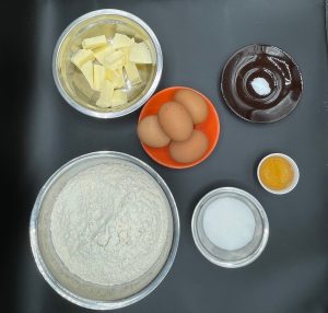 | 500 g de farine 70 g de beurre à température ambiante 40 g de sucre 4 œufs 2 CAS de Cognac 2 pincées de sel Du sucre glace Un bain de friture (j’utilise une vielle casserole et de l’huile Isio 4) |