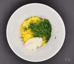 Délayez 3 c.à.s de mayonnaise avec le jus de citron/gélatine. Incorporez le raifort et l’aneth ciselée à la préparation.