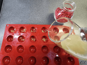Dans un moule Flexipan à demi-sphères (diam. 3 cm) mettez trois baies roses et du citron caviar si vous en avez.