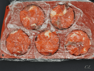 J’utilise des moules Flexipan mais attention, il est préférable de les chemiser avec un film transparent car le plastique absorbe les odeurs. Si vous n’en avez pas, utilisez n’importe quel contenant chemisé d’un film plastique qui facilitera le démoulage.