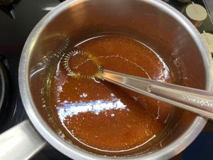 Commencez par mettre 200g de sucre puis à chaque fois qu’il fond rajoutez le reste petit à petit, tout en remuant.