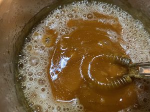 Une fois que vous avez obtenu une belle couleur, ajoutez le beure petit à petit en émulsionnant au fouet ou à la cuillère magique.