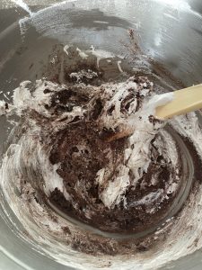 Dans un grand récipient, mélanger les 75 g de blancs non montés avec le mélange sucre/poudre d’amande/cacao.